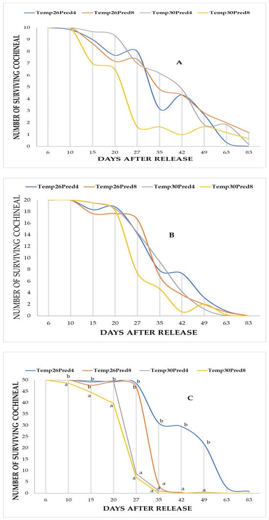 Mean number of surviving D. opuntiae at 3 prey densities over 83 days after release of H. trifurcata (4 and 8 predators/cladode) and at 2 temperatures (26 and 30 °C). (A): 10 colonies/cladode; (B): 20 colonies/cladode; and (C): 50 colonies/cladode. Means with the same letter are not significantly different at p ≤ 5% according to the Newman-Keuls test.