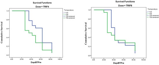 Survival function curves for 2 tested release rates (TRIF4 and TRIF8) at 2 constant temperatures (26 and 30 °C) varying with number of days before total predation (DaysBTPre).