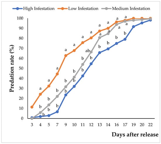 The first predation impact was observed 19 days (3rd week) after the release of H. trifurcata, but it was not statistically significant (p > 0.05). In fact, the first significant effect (p < 0.01) was observed during the fourth week, and the most important predation rate was observed on cladodes with low cochineal infestation, even though this rate was quite low at 24%. From the 5th to 11th week, the predation rate increased gradually with the same trend for three infestation levels, forming two different groups: the first with high and medium infestation and the second with low infestation (Figure 3). The predation rates ranged from 3 to 42%, 14 to 54%, and 32 to 76% for high, medium, and low infestation, respectively. During the 12th week, the results of medium infestation seemed to be approaching those of the low-infestation group, forming three separate groups. The predation rates of H. trifurcata on D. opuntiae were 55, 66, and 80% for high, medium, and low infestation, respectively. From the 13th to the 17th week after release, the predation rates continued to increase significantly. However, during this period, the low and medium infestations were considered to be statistically within the same group, and predation rates ranged from 87 to 98% and 81 to 97%, respectively. The predation rate in the high-infestation group ranged from 66 to 79%. After the 17th week, the predation rates exceeded 91%, although there was no significance (p > 0.05) of the effect of cochineal density on the predation rates. As shown in Table 6 and Table 7 and Figure 4, the effect of infestation levels on the survival function is significant (Log-Rank p < 0.05), and the medians of the survival curves were 111, 118, and 130 days after H. trifurcata release for low, medium, and high cochineal infestation levels, respectively (Table 6 and Table 7, Figure 4).