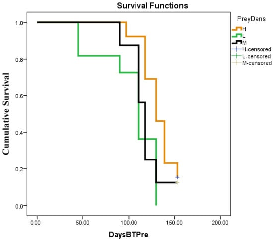 Survival function curves for H. trifurcata predation under field conditions depending on cochineal density per cladode with number of days before total predation (DaysBTPre). H: high (more than 100); M: medium (from 51 to 100); and L: low (less or equal to 50).
