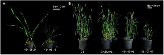 Analysis of agronomic traits revealed that among a subset of 491-07 and 494-05 F3:4 progeny, with crosses between wild emmer wheat chromosome arm substitution line CASL4AL and Chinese Spring (CS) cultivar, arose spontaneously stunted growth (Figure 1). Further examination displayed a significant decrease (p < 0.05) from CS in terms of plant height, flag leaf width, spike length, spikelet number, and grains per spike (Figure 2, Table S1). The most severe reductions occurred in flag leaf width, with mean data showing a 34% and 30% decrease in 491-07 and 494-05 lines, respectively, and a reduction in grain number per spike of 75% and 64%. In certain extreme instances, the grain number per spike plummeted to two grains, highlighting the severe spike sterility that significantly constrains offspring production in these weakened lines.