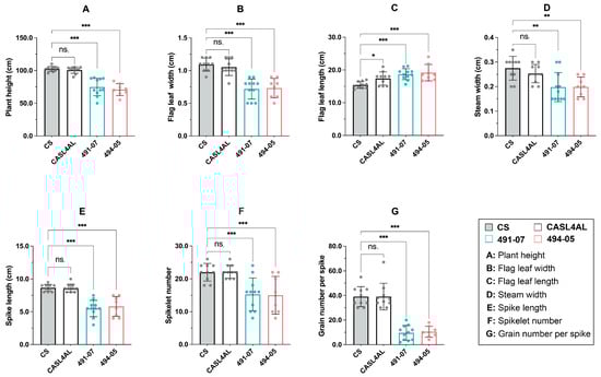 Agronomic traits (A–G) of weak plants from 491-07 and 494-05 lines and their parents. The x-axis represents the plants, the y-axis represents the measured values of agronomic traits. *, **, *** represent significance at p-values ≤ 0.05, 0.01 and 0.001, respectively. ns. represents no significance at p-values > 0.05. Analysis of variance (ANOVA) and the least significant difference (LSD) were used to test the significance.
