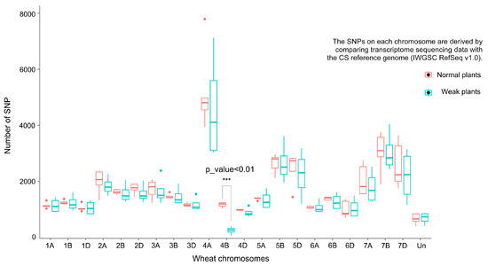 SNP counts on each chromosome based on transcriptome sequencing data of weak and normal plants, respectively. The x-axis represents wheat chromosomes, the y-axis represents the average number of SNP. The red box type represents the normal plants’ data, and the green box type represents the weak plants’ data. *** indicates an extremely significant difference (p ≤ 0.001). The SNP counts on chromosome 4B showed an extremely significant reduction in weak plants as compared with normal plants.
