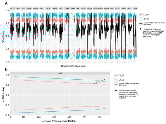 Δ(SNP-index) values on each chromosome (A) by BSR-seq of combined weak and normal pools (A and B bulk), and the Δ(SNP-index) values on chromosome 4B (B). The Δ(SNP-index) = (SNP-index of the B bulk) − (SNP-index of the A bulk). The x-axis represents wheat chromosomes’ genomic position; the y-axis represents the Δ(SNP-index). The black lines represent the Δ(SNP-index) value of every SNP locus. Magenta lines (CI_95) mean 95% confidence interval, and turquoise lines (CI_99) mean 99% confidence interval. Only 271 SNPs were detected on chromosome 4B, causing most Δ(SNP-index) values on 4B to be absent.