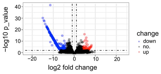 Volcano plot comparing the DEGs between weak and normal plants from RNA-seq data. The p-values < 0.05 of log2 fold change ≥ 1 and log2 fold change ≤ −1 are in red and blue dots, respectively, showing the significant upregulated and downregulated genes. Black dots indicate the remaining genes present in the array that were not significantly changed. The values of log2 fold change < −10 concentrated on chr4B.