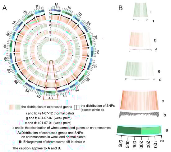 Distribution of expressed genes and SNPs on chromosomes in weak and normal plants (A) and enlarged image of chromosome 4B (B). a: the length of chromosome and the position of centromere in wheat. The light color is the short arm of the chromosome and the dark color is the long arm of the chromosome. c and b: the distribution of wheat annotated genes on chromosomes. e and d: the distribution of 491-07-01’s (weak plant) detected SNPs and expressed genes; g and f: the distribution of 491-07-07’s (weak plant) detected SNPs and expressed genes; i and h: the distribution of 491-07-12’s (normal plant) detected SNPs and expressed genes. The distribution of expressed genes and SNPs on the short arm of chromosome 4B in weak plants is shown in the red box.