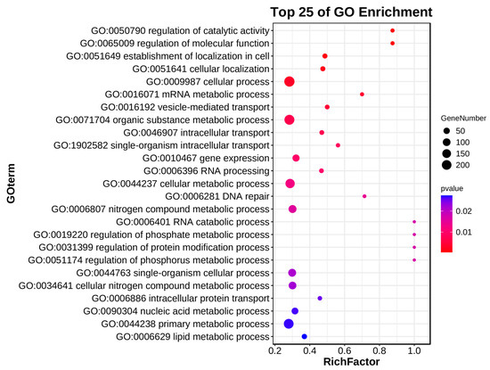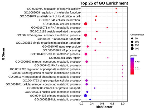 For the purpose of exploring the biological functions and signaling pathways associated with the DEGs on chromosome 4B, GO (Gene Ontology) enrichment and KEGG (Kyoto Encyclopedia of Genes and Genomes) pathway analyses were performed on 1244 downregulated DEGs. Among the top 25 enriched terms (p < 0.05), the main significantly associated biological processes included regulation of catalytic activity and molecular function (GO:0050790/GO:0065009), RNA metabolic processes (GO:0016071/GO:0006396/GO:0006401), transport systems (GO:0016192/GO:0046907/GO:1902582), and DNA repair (GO:0006281) (Figure 7). As for the KEGG pathway analysis results, only the mRNA surveillance pathway was significantly enriched (p < 0.05). Although other pathways did not reach statistical significance, the ribosome, linoleic acid metabolism, and spliceosome pathways contained relatively high gene numbers with rich factors > 0.3 (Figure 8).