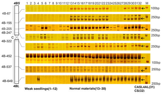 PCR profiling of SSR markers in weak and normal plants from 491-07 and 494-05 lines and their parents. The numbering of the SSR markers and their distributions on chromosome 4B are shown on the left, and the makers are named by chromosome-amplification region, the regions are in Mb. M: molecular marker. Lane 1–12: weak plants. Lane 13–30: normal plants. Lane 31: CASL4AL. Lane 32: CS. The arrow indicates the chromosome 4B specific bands.