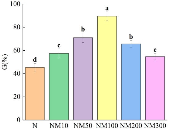 Effect of MT on Maize Seed germination under NaCl Stress. Data are shown as means ± SD. Different letters indicate the significant difference among different treatments at the significant level of p < 0.05, as determined by one-way ANOVA. G%: the germination percentage; N: NaCl; NM10: 150 mmol NaCl + 10 µM MT; NM50: 150 mmol NaCl + 50 µM MT; NM100: 150 mmol NaCl + 100 µM MT; NM200: 150 mmol NaCl + 200 µM MT; NM300: 150 mmol NaCl + 300 µM MT.