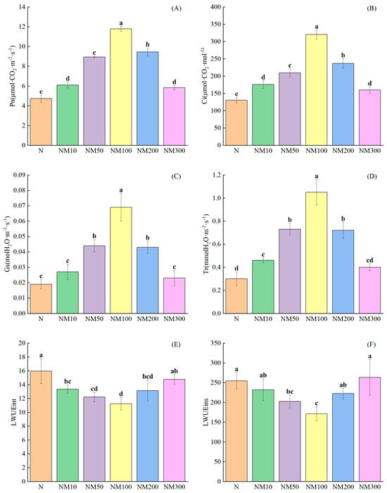 Photosynthetic parameters can reflect the physiological status and changes in maize seedlings under salt stress []. Salt stress significantly inhibited photosynthesis, decreasing Pn (52.32%), Ci (50.34%), Gs (63.46%), and Tr (64.29%) (p < 0.05) (Figure 2). Application of exogenous 50 µM MT was effective in alleviating the damage of photosynthesis by salt stress and increased Pn (88.79%) and Ci (60.2%). NM100 had the greatest effect on Gs and Tr, which were increased by 263.16% and 250%, respectively (Figure 2C,D). However, higher concentrations of MT resulted in a decrease in these indices, but they were still higher than N, except that Tr decreased by 42.38% in the NM300 treatment (Figure 1). Moreover, LWUEint and LWUEins were significantly increased by 34.54% and 32.16% (p < 0.05), respectively, with no treatment (Figure 2E,F), but the application of exogenous 100 µM MT decreased LWUEint and LWUEins by 29.56% and 32.73%, respectively.