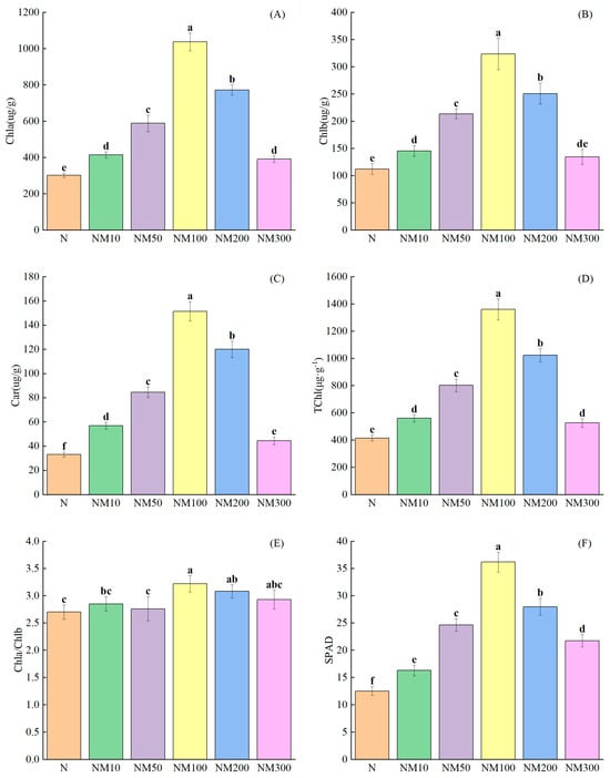Effects of Exogenous melatonin (MT) on Chlorophyll Accumulation of Maize Seedlings under NaCl Stress. The error lines in the figure represent the standard deviation (SD) based on three replicates (n = 3). Different letters indicate the significant difference among different treatments at the significant level of p < 0.05, as determined by one-way ANOVA. (A) Chla: chlorophyll a; (B) Chlb: chlorophyll b; (C) Car: carotenoids; (D) Tchl: total chlorophyll content; (E) Chla/Chlb: ratio of chlorophyll a to chlorophyll b; (F) SPAD: the relative chlorophyll content. N: NaCl; NM10: 150 mmol NaCl + 10 µM MT; NM50: 150 mmol NaCl + 50 µM MT; NM100: 150 mmol NaCl + 100 µM MT; NM200: 150 mmol NaCl + 200 µM MT; NM300: 150 mmol NaCl + 300 µM MT.