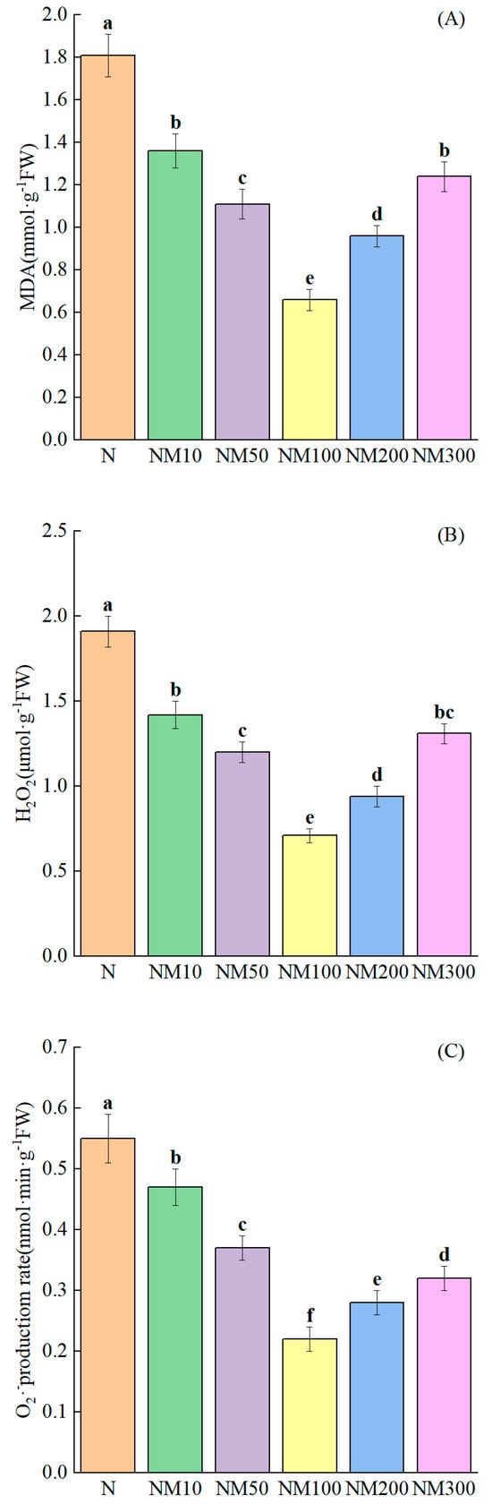 Effect of Exogenous melatonin (MT) on cell membrane damage of Maize Seedlings under NaCl stress. The error lines in the figure represent the standard deviation (SD) based on three replicates (n = 3). Different letters indicate the significant difference among different treatments at the significant level of p < 0.05, as determined by one-way ANOVA. (A) MDA: malondialdehyde; (B) H2O2: hydrogen peroxide; (C) O2−: the rate of superoxide anion production; N: NaCl; NM10: 150 mmol NaCl + 10 µM MT; NM50: 150 mmol NaCl + 50 µM MT; NM100: 150 mmol NaCl + 100 µM MT; NM200: 150 mmol NaCl + 200 µM MT; NM300: 150 mmol NaCl + 300 µM MT.