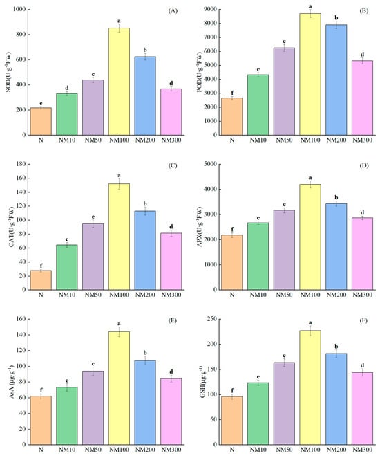 Effects of Exogenous melatonin (MT) on Antioxidant Enzyme Activities of Maize Seedlings under NaCl stress. The error lines in the figure represent the standard deviation (SD) based on three replicates (n = 3). Different letters indicate the significant difference among different treatments at the significant level of p < 0.05, as determined by one-way ANOVA. (A) SOD: superoxide dismutase; (B) POD: peroxidase; (C) CAT: catalase; (D) APX: ascorbate peroxidase; (E) AsA: ascorbic acid; (F) GSH: glutathione; N: NaCl; NM10: 150 mmol NaCl + 10 µM MT; NM50: 150 mmol NaCl + 50 µM MT; NM100: 150 mmol NaCl + 100 µM MT; NM200: 150 mmol NaCl + 200 µM MT; NM300: 150 mmol NaCl + 300 µM MT.