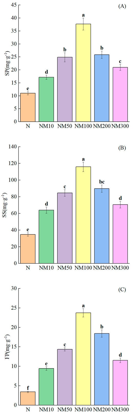 Effect of Exogenous melatonin (MT) on osmoregulatory substances in Maize Seedlings under NaCl stress. The error lines in the figure represent the standard deviation (SD) based on three replicates (n = 3). Different letters indicate the significant difference among different treatments at the significant level of p < 0.05, as determined by one-way ANOVA. (A) SP: soluble protein; (B) SS: soluble sugar; (C) FP: free proline. N: NaCl; NM10: 150 mmol NaCl + 10 µM MT; NM50: 150 mmol NaCl + 50 µM MT; NM100: 150 mmol NaCl + 100 µM MT; NM200: 150 mmol NaCl + 200 µM MT; NM300: 150 mmol NaCl + 300 µM MT.