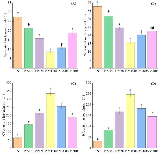 Effect of Exogenous melatonin (MT) on Ion Content in Maize Seedlings Roots and Leaves under NaCl stress. The error lines in the figure represent the standard deviation (SD) based on three replicates (n = 3). Different letters indicate the significant difference among different treatments at the significant level of p < 0.05, as determined by one-way ANOVA. (A) Na+ content in leaves; (B) K+ content in roots; (C) Na+ content in leaves; (D) Na+ content in roots. N: NaCl; NM10: 150 mmol NaCl + 10 µM MT; NM50: 150 mmol NaCl + 50 µM MT; NM100: 150 mmol NaCl + 100 µM MT; NM200: 150 mmol NaCl + 200 µM MT; NM300: 150 mmol NaCl + 300 µM MT.