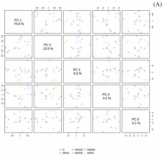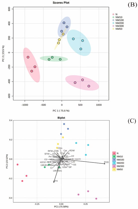 The principal components analysis explained 99.1% of the total variance in the first two axes (PC1 and PC2) (Figure 8A). Each treatment group exhibited significant differentiation along the axes of PC1 and PC2 (Figure 8B). Malondialdehyde (MDA), hydrogen peroxide (H2O2), seedling leaf area (SLA), intercellular CO2 concentration (Ci), Na+ content in roots (root Na), Na+ content in leaves (leave Na), leaf instantaneous water use efficiency (LWUEins), germination percentage (GP), and ascorbate peroxidase (APX) had a high relationship with 100 mM NaCl treatment (N) and 100 mM NaCl and 10 µM MT treatment (NM10). Sprout length (SL), leaf intrinsic water use efficiency (LWUEint), ascorbic acid (AsA), glutathione (GSH), ratio of chlorophyll a to chlorophyll b (Chla/Chlb), relative chlorophyll content (SPAD), soluble sugar (SS), soluble protein (SP), K+ content in leaves (leave K), K+ content in roots (root K), and peroxidase (POD) had a high relationship with 100 mM NaCl and 300 µM MT treatment (NM300). Carotenoids (Car), root length (RL), root fresh weight (RFW), chlorophyll a (Chla), sprout fresh weight (SFW), total chlorophyll content (TChl), superoxide dismutase (SOD), and free proline (FP) had a high relationship with 100 mM NaCl and 100 µM MT treatment (NM100) and 100 mM NaCl and 200 µM MT treatment (NM200). The rate of superoxide anion production (O2−), sprout dry weight (SDW), photosynthetic rate (Pn), root dry weight (RDW), stomatal conductance (Gs), chlorophyll b (Chlb), and transpiration rate (Tr) had a high relationship with 100 mM NaCl and 100 µM MT treatment (NM100) (Figure 8B).
