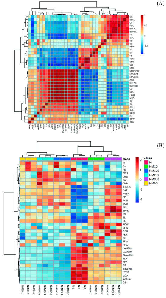 Correlation analysis (A) and heatmap analysis (B) of various index changes of maize seeds and seedlings induced by exogenous melatonin (MT) under NaCl stress. GP: germination percentage; RL: root length; SL: sprout length; RFW: root fresh weight; SFW: sprout fresh weight; RDW: root dry weight; SDW: sprout dry weight; SLA: seedling leaf area; Pn: photosynthetic rate; Ci: intercellular CO2 concentration; Gs: stomatal conductance; Tr: transpiration rate; LWUEint: leaf intrinsic water use efficiency; LWUEins: leaf instantaneous water use efficiency; Chla: chlorophyll a; Chlb: chlorophyll b; Car: carotenoids; Tchl: Total chlorophyll content; Chla/Chlb: Ratio of chlorophyll a to chlorophyll b; SPAD: the relative chlorophyll content; MDA: malondialdehyde; H2O2: hydrogen peroxide; O2−: the rate of superoxide anion production; SOD: superoxide dismutase; POD: peroxidase; CAT: catalase; APX: ascorbate peroxidase; AsA: ascorbic acid; GSH: glutathione; SP: soluble protein; SS: soluble sugar; FP: free proline; leave Na: Na+ content in leaf; root Na: Na+ content in root; leave K: K+ content in leaf; root K: K+ content in root; N: NaCl; NM10: 150 mmol NaCl + 10 µM MT; NM50: 150 mmol NaCl + 50 µM MT; NM100: 150 mmol NaCl + 100 µM MT; NM200: 150 mmol NaCl + 200 µM MT; NM300: 150 mmol NaCl + 300 µM MT.
