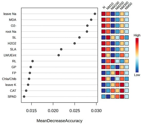 Random Forest analysis of various indexes of maize seeds and seedlings induced by exogenous melatonin (MT) under NaCl stress. SL: sprout length; SLA: seedling leaf area; RL: root length; LWUEint: leaf intrinsic water use efficiency; Chla/Chlb: Ratio of chlorophyll a to chlorophyll b; SPAD: the relative chlorophyll content; MDA: malondialdehyde; H2O2: hydrogen peroxide; O2−: the rate of superoxide anion production; CAT: catalase; FP: free proline; leave Na: Na+ content in leaf; root Na: Na+ content in root; leave K: K+ content in leaf; N: NaCl; NM10: 150 mmol NaCl + 10 µM MT; NM50: 150 mmol NaCl + 50 µM MT; NM100: 150 mmol NaCl + 100 µM MT; NM200: 150 mmol NaCl + 200 µM MT; NM300: 150 mmol NaCl + 300 µM MT.