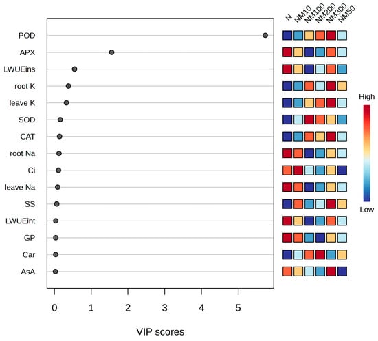 The variable importance for projection (VIP) values from the partial least squares (PLS) model and the primary factors influencing maize seeds and seedlings exposure to exogenous application of different concentrations of MT under NaCl stress conditions. (VIP > 0.1). Ci: intercellular CO2 concentration; LWUEint: leaf intrinsic water use efficiency; LWUEins: leaf instantaneous water use efficiency; Car: carotenoids; SOD: superoxide dismutase; POD: peroxidase; CAT: catalase; APX: ascorbate peroxidase; AsA: ascorbic acid; SS: soluble sugar; leave Na: Na+ content in leaf; root Na: Na+ content in root; leave K: K+ content in leaf; root K: K+ content in root; N: NaCl; NM10: 150 mmol NaCl + 10 µM MT; NM50: 150 mmol NaCl + 50 µM MT; NM100: 150 mmol NaCl + 100 µM MT; NM200: 150 mmol NaCl + 200 µM MT; NM300: 150 mmol NaCl + 300 µM MT.