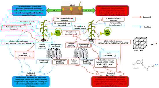 Currently, most of the studies on exogenous MT to cope with growth regulation under abiotic stress have been focused on rice [], potato [], barley [], and oilseed rape [], whereas there are few reports around the application of different concentrations of exogenous MT on maize seed germination and seedling salt damage under salt stress. Therefore, in this study, we used a dominant maize variety (YR668) as the material, simulated salt stress with NaCl (100 mM), and applied exogenously fading MT by dipping and watering to investigate the effects of different concentrations of exogenous MT on maize seed germination and seedling growth under salt stress, aiming to alleviate soybean salt damage and provide valuable references for the selection of excellent salt-tolerant maize varieties, the improvement of saline soil, and how to maintain corn yield to provide valuable references.