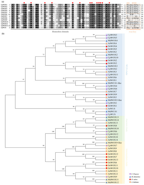 Conserved domain and evolutionary analysis of CpWOX proteins. (a) Sequence alignment of the homeobox domain and WUS-box motif of CpWOX proteins, with red arrows indicating the 13 conserved positions of the helix-loop-helix-turn-helix structure, and orange arrows pointing to the conserved positions of the WUS-box motif. (b) Phylogenetic tree of WOX family members from wintersweet, apple, rice, and Arabidopsis. Phylogenetic tree was constructed using the neighbour-joining (NJ) method, with 1000 bootstrap replicates, using MEGA X.