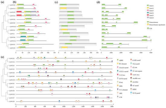 Analysis of conserved motifs, gene structure, and promoter cis-acting elements of CpWOX. (a) Phylogenetic tree of CpWOX family. (b) Conserved motif. Motifs 1–6 are represented in different coloured boxes, and the box length represents motif length. (c) Homeodamain and Homeodamain superfamily conserved domains of CpWOX proteins in wintersweet. (d) Intron-exon structure. Green boxes represented exons, and black lines represented introns. (e) Cis-acting elements predicted using PlantCARE.