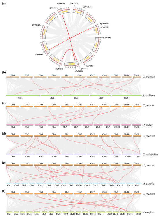Chromosomal localisation and synteny analysis of CpWOX family genes. (a) Chromosomal location and synteny analysis of CpWOX genes; synteny analysis of wintersweet with Arabidopsis (b), rice (c), Chimonanthus salicifolius (d), apple (e), and grape (f).
