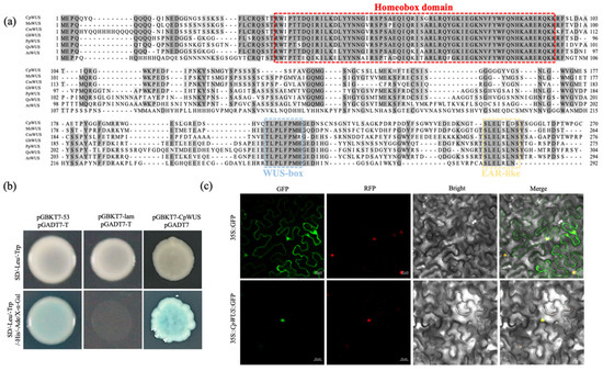 Sequence analysis showed that the coding sequence (CDS) of CpWUS is 813 bp, encoding 270 amino acid residues. CpWUS contains a homeobox domain, a WUS-box, and an EAR-like motif (Figure 4a). We used a yeast system to analyse the transcriptional activity of CpWUS. The results showed that pGBKT7-WUS and pGADT7 co-transformed into Y2H Gold yeast strain grew normally and turned blue on SD/-Leu/-Trp/-His/-Ade/X-α-Gal medium, indicating that CpWUS has self-activating transcriptional activity (Figure 4b). Further verification of the subcellular localisation of CpWUS (Figure 4c) in tobacco epidermal cells transiently expressing 35S::CpWUS::GFP showed that the fluorescent signal was mainly located in the nucleus, indicating that CpWUS predominantly functions in the nucleus.