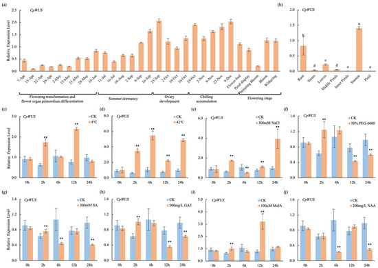 Expression profile analysis of CpWUS. (a) Expression of CpWUS in buds at different flowering stages. (b) Tissue-specific expression characteristics of CpWUS. Different lowercase letters above bars indicate significant differences. CpWUS expression characteristics under treatments of 4 °C (c), 42 °C (d), 300 mM NaCl (e), 50% PEG-6000 (f), 300 mM SA (g), 500 mg/L GA3 (h), 100 mM MeJA (i), and 200 mg/L NAA (j) using a six-leaf stage wintersweet as material. CK refers to untreated wintersweet. ** p < 0.01.