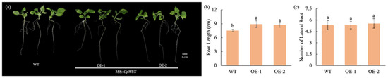 CpWUS promotes primary root length in Nicotiana benthamiana. (a) Root phenotype of CpWUS transgenic N. benthamiana after 21 days of growth. Root length (b) and number of lateral roots (c) in CpWUS transgenic lines. Different lowercase letters indicate significant differences.
