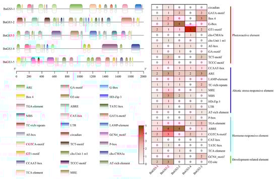 Prediction of cis-acting elements in the GS3 gene family of Brassica napus. The colored boxes on the left represent different cis-acting elements, with the names of each element marked below, and the numbers on the right indicate the quantities of the corresponding cis-acting elements in the Brassica napus GS3 genes.