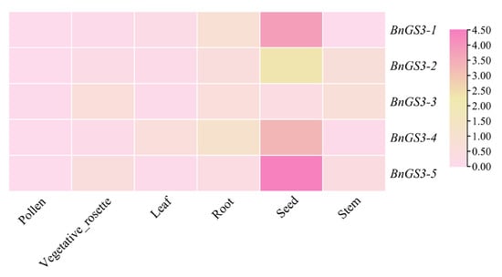 By utilizing data from the BnIR database, the expression levels of Brassica napus GS3 gene family members were analyzed across various tissues—including roots, stems, leaves, pollen, rosettes, and seeds, as shown in Figure 4. The GS3 genes were expressed in all tissues of Brassica napus, with the highest expression observed in seeds and the lowest in pollen.