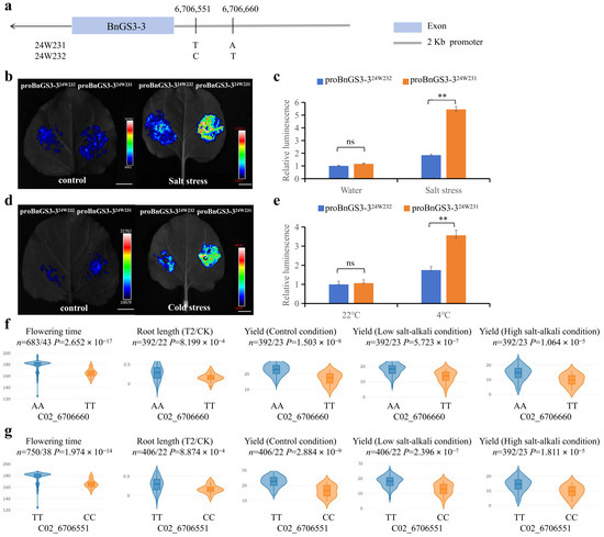 By cloning and sequencing the BnGS3-3 promoter in 24W231 and 24W232, we identified sequence variations at 23bp and 132bp upstream of ATG, precisely located at physical positions 6706551 and 6706660 on chromosome C2 (Figure 7a). To explore the differential responses of BnGS3-3 gene promoters from these materials to salt and low-temperature stresses, Agrobacterium strains harboring vectors with either pBnGS3-324W231pro-GreenII-0800-LUC (proBnGS3-324W231) or pBnGS3-324W232pro-GreenII-0800-LUC (proBnGS3-324W232) were transiently transformed into tobacco leaves (Figure 7b-e). Subsequently, the tobacco plants were exposed to salt and low-temperature treatments. Following these stresses, the area injected with the bacterial solution containing the proBnGS3-324W231 vector (right side of the leaf) displayed significantly higher luciferase activity (brightness) than the area injected with the bacterial solution containing the proBnGS3-324W232 vector (left side of the leaf) (Figure 7b,d). This suggests that under salt and low-temperature stresses, the BnGS3-3 promoter in 24W231 exhibits much higher activity compared to that in 24W232.