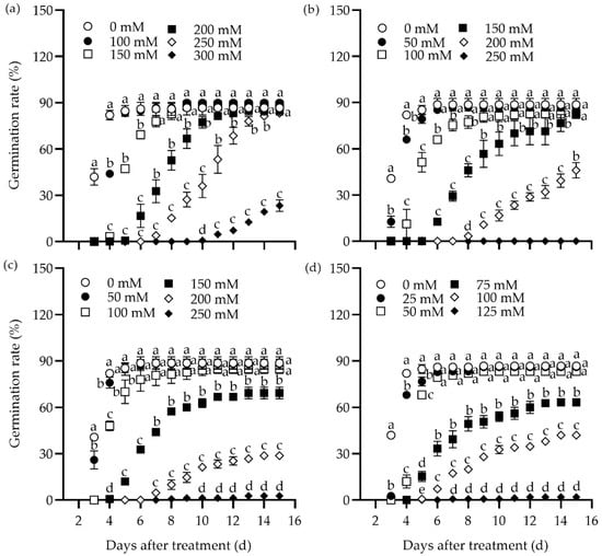 Dynamic responses of the germination rate in the tall wheatgrass line Zhongyan 1 to varying concentrations of NaCl (a), Na2SO4 (b), NaHCO3 (c), and Na2CO3 (d). Data are represented as mean ± SE (n = 3). Different letters indicate that the difference was significant at p < 0.05.