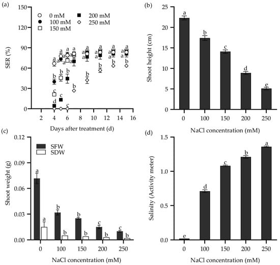 The seedling emergence rate (SER) (a), shoot height (b), and shoot weight (SFW, shoot fresh weight; SDW, shoot dry weight) (c) of the tall wheatgrass line Zhongyan 1 subjected to varying concentrations of NaCl solution. (d) The salinity of vermiculite medium after NaCl treatment, which was measured with a PNT3000 activity meter. Data are represented as mean ± SE (n = 3 for (a,c); n = 20 for (b,d)). Different letters indicate that the difference was significant at p < 0.05.