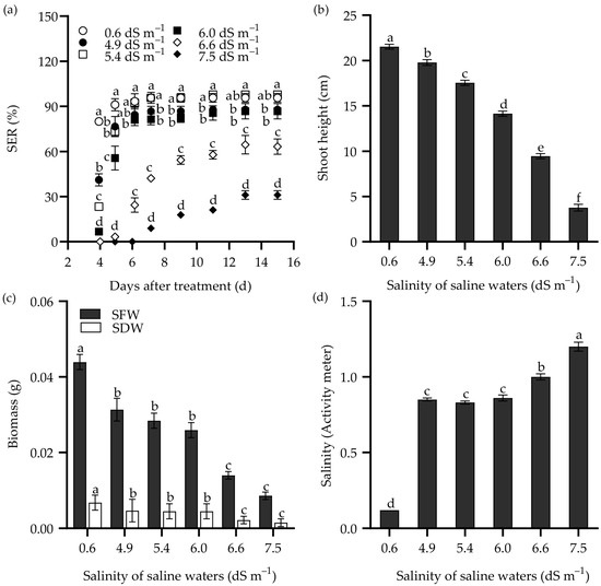 The seedling emergence rate (SER) (a), shoot height (b), and shoot weight (SFW, shoot fresh weight; SDW, shoot dry weight) (c) of the tall wheatgrass line Zhongyan 1 subjected to saline water. (d) The salinity of cultured vermiculite medium after saline water treatment, which was measured with a PNT3000 activity meter. Data are represented as mean ± SE (n = 3 for (a,c); n = 20 for (b,d)). Different letters indicate that the difference was significant at p < 0.05.