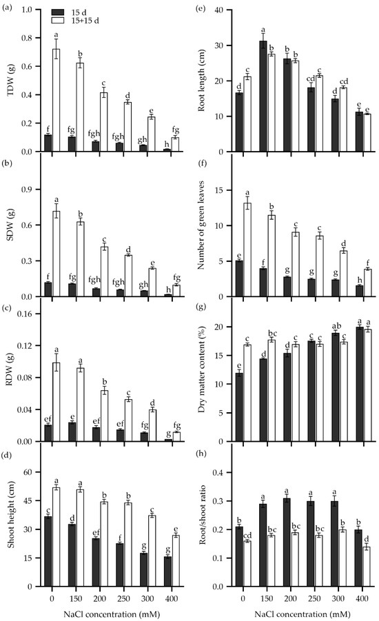 To explore the recovery of seedling growth, NaCl was removed, and the Zhongyan 1 seedlings were cultured in nutrient solution for an additional 15 d. As shown in Figure 4, the TDW, SDW, RDW, shoot height, and number of green leaves increased, while the root/shoot ratio declined. The increments in dry matter and the number of green leaves declined with the pervious increase in NaCl concentration. For instance, after removal of salt stress and recovery for 15 d, the growth inhibition rates for the 150, 200, 250, 300, and 400 mM NaCl treatments were 13.5%, 42.3%, 51.6%, 66.2%, and 85.9% of TDW under non-stress, respectively. Comparatively, the dry matter content of seedlings increased significantly under 150 and 200 mM NaCl but decreased slightly under 250–400 mM NaCl after the removal of NaCl stress. Taken together, a 15 d treatment with 300 mM NaCl resulted in inhibition rates of 50%, 64.3%, and 61.8% for RDW, SDW, and TDW, respectively, which may be suitable for evaluation of seedling tolerance to salt stress in tall wheatgrass.