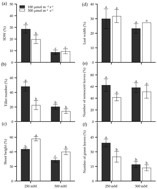Seedling growth of the tall wheatgrass line Zhongyan 1 cultured in two growth light intensities subjected to NaCl stress, relative to non-stress condition. (a) Shoot dry weight (SDW); (b) tiller number; (c) shoot height; (e) leaf width; (d) the number of senescent leaves; (f) the number of green leaves. Data are represented as mean ± SE (n = 6). Different letters indicate that the difference was significant at p < 0.05.