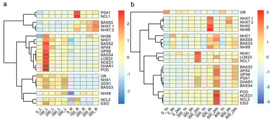 Short-term salt stress (300, 500, and 800 mM NaCl within 24 h) affected the expression of all the investigated genes in the leaves of Zhongyan 1 (Figure 6b). Three genes, NHX1, LOX23, and NCL1, were highly induced after 24 h of treatment with 300 mM NaCl. Five NHX genes, NHX7.1, NHX7.2, NHX2, NHX6, and NHX8, were induced after 6 h of exposure to 500 mM NaCl, while eleven genes, including NHD1, BASS5, BASS2, APX4, GPX6, DHAR1, BASS4, POD, NCED1, NCL2, and ESI3, were induced after 24 h of exposure to 500 mM NaCl. The GR gene appeared to be inhibited, whereas PSA1 was induced by 300, 500, and 800 mM NaCl treatments for 24 h. The BASS3 gene was induced by 500 and 800 mM NaCl for 6 and 24 h, respectively. Overall, both long- or short-term salt stress, resulting from different concentrations of NaCl, led to differential expression of salt-response genes. Specifically, the expression of salt-response genes in leaves was predominantly induced by long term (15 d) treatment with 150 mM NaCl and by short-term exposure to 500 mM NaCl.