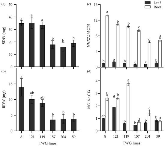 The shoot dry weight (SDW) (a), root dry weight (RDW) (b), and relative expression of NHX7.1 (c) and NCL1 (d) in six tall wheatgrass lines exposed to 300 mM NaCl stress for 15 d. Data are represented as mean ± SE (n = 8 for (a,b); n = 4 for (c,d)). Different letters indicate that the difference was significant at p < 0.05. The actin gene ACT4 was taken as an internal reference gene.