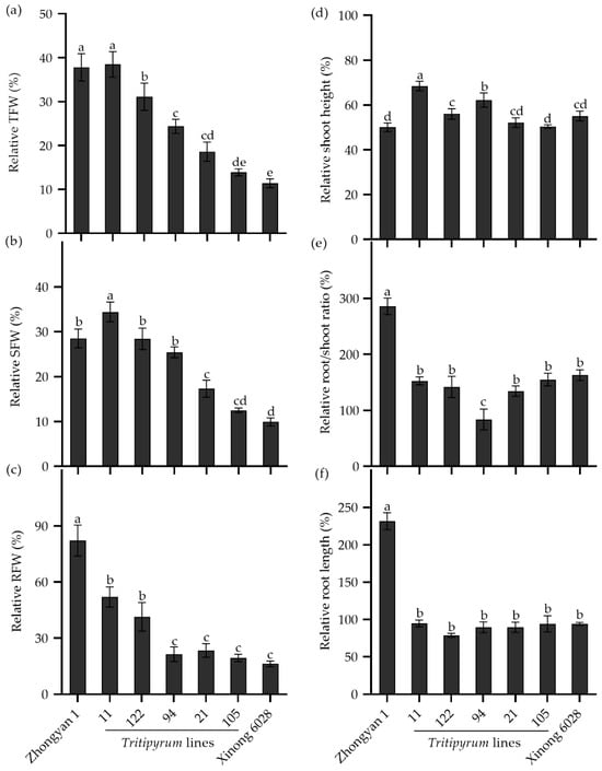 The relative seedling growth traits in the Tritipyrum lines and their parents Zhongyan 1 and Xinong 6028 under salt stress relative to non-stress control. (a) Relative TFW, relative total fresh weight; (b) relative SFW, relative shoot fresh weight; (c) relative RFW, relative root fresh weight; (d) relative shoot height; (e) relative ratio of root to shoot fresh weight; (f) relative root length. Data are represented as mean ± SE (n = 6). Different letters indicate that the difference was significant at p < 0.05.
