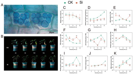 The biochemical features were determined for samples from both the Si group and CK group subjected to drought treatment for 0, 5, 10, 15, and 20 days, with three biological replicates and three technical replicates for each sample. A 0.1 g sample was ground into powder using liquid nitrogen, mixed with 1 mL of phosphate buffer (100 mM, pH = 7.8), and homogenized on an ice bath. The mixture was subsequently centrifuged at 4 °C and 12,000 rpm for 10 min, and the supernatant was collected for SOD, POD, and CAT activities and MDA, and soluble protein contents assays. Then, 0.1 g of frozen leaves was homogenized in 1 mL of distilled water and then placed in a 95 °C water bath for 10 min. After cooling, the mixture was centrifuged at 25 °C and 8000 rpm for 10 min. Subsequently, 0.1 mL of the supernatant was transferred into a 1.5 mL centrifuge tube, and 0.9 mL of distilled water was added to prepare the soluble sugar assay mixture. Then, 0.1 g of leaves mixed with 1 mL 3% sulfosalicylic acid were shaken in a 95 °C water bath for 10 min. The solution was then centrifuged at 10,000 rpm and 25 °C for 10 min, and the supernatant was collected after cooling as the proline extract.