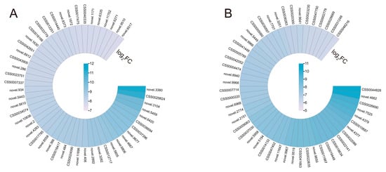 S. indica elicits particular alterations in gene expression in reaction to drought stress. The 50 DEGs with the highest log2 (fold change, FC) in both Si-D10d vs. CK-D10d and Si-D20d vs. CK-D20d were selected for study (Figure 3; Table S2). In the set of Si-D10d vs. CK-D10d, multiple drought stress-responsive genes were identified, including heat shock 70 kDa protein (Hsp70, novel.9677), late embryogenesis abundant (LEA, novel.5610), and genes related to stomatal closure and K+ transport (novel.9510 and novel.8912) (Figure 3A; Table S2). In the Si-D20d vs. CK-D20d set, eight glutathione S-transferase (GST) genes (CSS0022141, CSS0026690, CSS0018634, novel.4377, CSS0022086, CSS0005789, CSS0031248, and CSS0028669) and eight key structural genes associated with flavonoid biosynthesis, including one leucoanthocyanidin reductase (LAR, CSS0009063), one anthocyanidin reductase (ANR, CSS0041663), three chalcone synthase (CHS, CSS0007714, CSS0004474, and CSS0030597), two anthocyanidin synthase (ANS, CSS0010687 and CSS0046216), and one flavonoid 3′,5′-hydroxylase (F3′5′H, CSS0014132), were found (Figure 3B; Table S2). Moreover, two MYB family genes (CSS0005060 and CSS0000220) were also identified. These findings demonstrated that S. indica could stimulate transcription factors (TFs) and genes involved in antioxidant defense, stomatal regulation, and ion transport.
