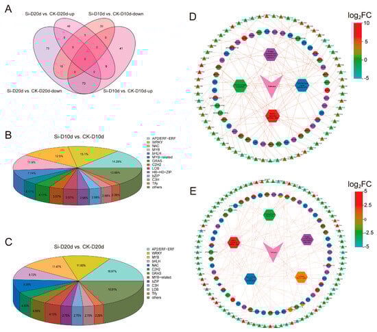 Transcription factors (TFs) analysis of S. indica-treated tea plant samples under drought stress. (A) Venn analysis of TFs in Si-D10d vs. CK-D10d and Si-D20d vs. CK-D20d. (B) Classification of identified TFs in Si-D10d vs. CK-D10d. (C) Classification of identified TFs in Si-D20d vs. CK-D20d. (D) Co-expression network of TFs and genes in significantly enriched KEGG pathways in Si-D10d vs. CK-D10d. (E) Co-expression network of TFs and genes in the significantly enriched KEGG pathways in Si-D20d vs. CK-D20d. Hexagons represent KEGG pathways, pies represent TFs, and triangles represent genes, with triangle colors shaded from light to dark based on the log2FC.