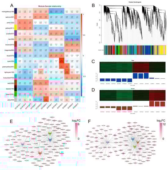 WGCNA was conducted on 25,738 genes based on gene expression patterns, generating 17 modules (Figure 5A,B). The blue and brown modules, which were strongly positively correlated with Si-D10d and Si-D20d, respectively, exhibited increased FPKM in S. indica-treated tea plants compared with the controls (Figure 5A–D). Therefore, these two modules were selected for further analysis.