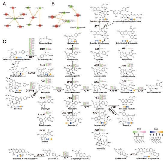 Co-expression analysis of DEGs and DAMs involved in flavonoid biosynthesis. (A) Interaction network of DEGs and DAMs involved in flavonoid biosynthesis in Si-D10d vs. CK-D10d. (B) Interaction network of DEGs and DAMs involved in flavonoid biosynthesis in Si-D20d vs. CK-D20d. Solid lines indicate positive correlations, dashed lines indicate negative correlations, and the thickness of the lines represents the strength of the correlation. (C) Expression profiles of DEGs and DAMs involved in flavonoid biosynthesis. C4H, cinnamate 4-hydroxylase; HCT, shikimate O-hydroxycinnamoyltransferase; CHS, chalcone synthase; DICGT, chalcononaringenin 2′-O-glucosyltransferase; CHI, chalcone isomerase; C12RT1, flavanone 7-O-glucoside 2″-O-beta-L-rhamnosyltransferase; F3H, flavanone 3-hydroxylase; F3′H, flavonoid 3′-hydroxylase; F3′5′H, flavonoid 3′,5′-hydroxylase; FNS1, flavone synthase I; FLS, flavonol synthase; UGT78D1, flavonol-3-O-rhamnosyltransferase; DFR, dihydroflavonol 4-reducatse; ANS, anthocyanidin synthase; ANR, anthocyanidin reductase; LAR, leucoanthocyanidin reductase; BZ1, anthocyanidin 3-O-glucosyltransferase; 3AT, anthocyanidin 3-O-glucoside 6″-O-acyltransferase; F3GT, flavonol 3-O-glucosyltransferase; FG3, flavonol-3-O-glucoside; F3S, flavonol 3-sulfotransferase; IF7GT, isoflavone 7-O-glucosyltransferase; I2′H, isoflavone 2′-hydroxylase.