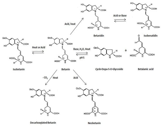 During heat processing, betanin may be degraded by cleavage (by heat or acids), decarboxylation, or isomerization [8] (Figure 2).