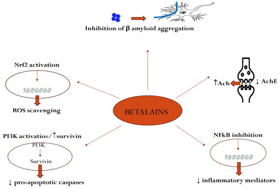 In Alzheimer’s disease, the cholinergic pathways are impaired causing significant memory and learning deficits. The enzyme acetylcholinesterase (AchE) breaks down synaptic acetylcholine, an important brain neurotransmitter involved in learning and cognition processes. Thus, an augmentation of cholinergic transmission by blocking the degradation of acetylcholine with acetylcholinesterase inhibitors has led to the authorization of several drugs like donepezil or rivastigmine, commonly used in the symptomatic treatment of Alzheimer’s disease [80]. Several studies investigated whether betalains were able to increase the cholinergic transmission by inhibiting acetylcholinesterase (AchE), the enzyme responsible for acetylcholine breakdown. The inhibitory activity of betalains on AchE was demonstrated in vitro, the main active compound betanin being able to cause a significant effect, comparable to donepezil (LogIC50 1.287 µM vs. 1.154 µM) [56]. A recent study from 2024, using PC12 cells, also showed that pretreatment with betanin 10–50 µM, caused a significant acetylcholinesterase inhibition [81].