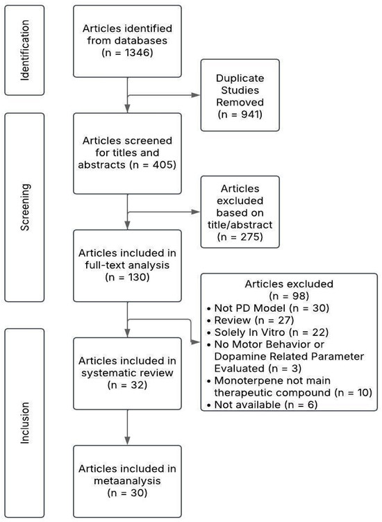 Since current therapies for PD have limitations in terms of their long-term efficacy and side effects, the search for plant-derived natural compounds as potential therapeutic agents has significantly increased in recent years. EOs have been used in traditional medicine in very ancient cultures. MTs stand out as the main bioactive components in EOs, being present in countless combinations whose interactions (synergistic, additive, and/or inhibitory) can produce variable effects according to the Eos’ composition [23,24]. For this reason, studying the effects and mechanisms of action of MTs provides valuable insights into their potential therapeutic use. In order to make advances in the knowledge of the application of MTs in PD, the meta-analysis of existing data shall prove to be a useful approach to integrate findings and construct a more comprehensive understanding of the matter. Furthermore, the analysis of MTs’ administration in preclinical animal models provides information that enhances their translation to clinical studies. Murine models of PD are widely used to study the neurodegenerative nigrostriatal process [25], as they exhibit behavioral, biochemical, and molecular neuroinflammatory alterations like those observed in humans. These models also demonstrate dopaminergic neuron loss driven by the formation of various oxidants and free radicals, neuroinflammation, lipid peroxidation, and the depletion of reduced glutathione. Despite its limitations in brain structures, murine models remain a valuable tool for investigating the pathogenesis and progression of PD [26].