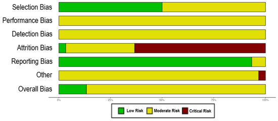 Figure 2 shows a graph of the overall risk of bias of each domain. We represent the percentage of publications included in the meta-analysis whose risk of bias was low (green), moderate (yellow), or critical (red). According to our analysis, 50% of publications included in the meta-analysis showed low risk of selection bias, while the other 50% showed moderate risk. All publications presented moderate risk of performance bias and detection bias. A high risk of attrition bias was predominant (63%), while 34% had moderate risk and only 3% of publications had low risk of bias. On the other hand, 93% of publications had a low risk of reporting bias, while 7% had moderate risk. Other risks of bias were considered moderate in 97% of publications and high in 3%. Overall, 14% of publications had a low risk of bias while the other 86% had a moderate risk.